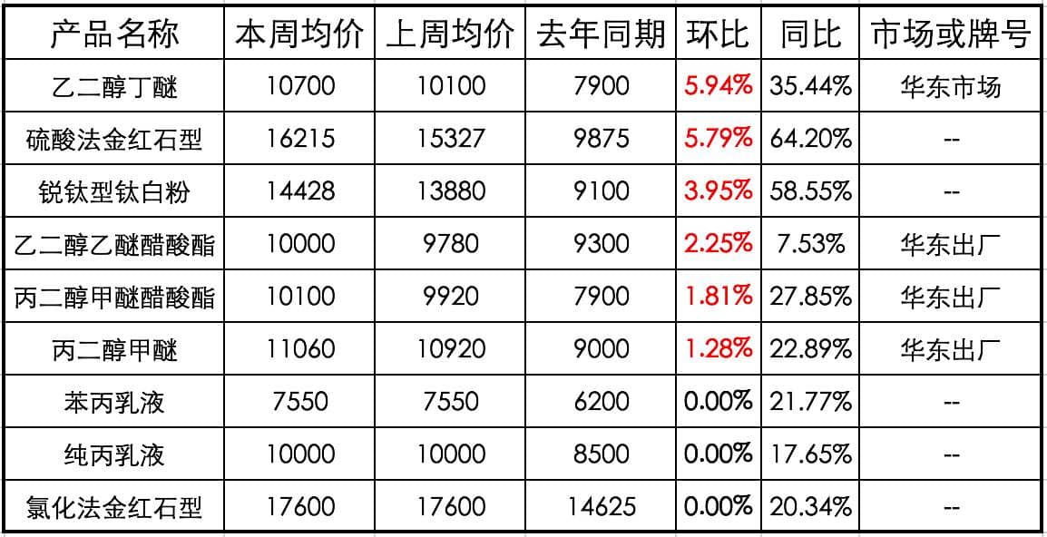 本周国内涂料市场基本面表现尚可。本周丙烯酸乳液市场交投气氛良好,产销较为顺畅。原料苯乙烯市场现货承压,市场持续回调;丙烯酸丁酯市场商谈重心止跌反弹,厂家报涨提振市场氛围;MMA市场厂商封盘惜售,价格面持续上行。丙烯酸乳液厂家报盘稳定为主,持续关注成本面走势,预计后市价格或补涨。本周国内乙二醇丁醚市场继续上探。近日乙烯持续上调,环氧乙烷于本周四再涨500元/吨,成本面对乙二醇丁醚市场提振作用明显。德纳企业乙二醇丁醚设备平稳开车,产品主要交付前期订单。港口方面有库存适中。目前多数下游工厂陆续重启,但价格高位下下游用户买兴不高。多数厂商在成本压力下报盘高调,出货一般。本周国内PM/PMA市场微幅整理。原料PO走势低迷,成本面对PM/PMA市场形成拖拽。供应方面, PM/PMA厂家装置平稳运行,库存适中。但需求方面未有明显好转,下游用户采购意向一般,多数厂商报盘稳定,个别厂家库存低位,报盘艰难上探。本周国内钛白粉商谈价格呈整体上涨趋势,厂家成本压力不减,加之厂家现货紧张,库存低位,业者心态看涨持续。