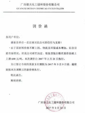 广西德天化工循环股份有限公司决定在2017年2月21日因材料价格上涨影响,锐钛型钛白粉在原价格基础上上调600元/吨。