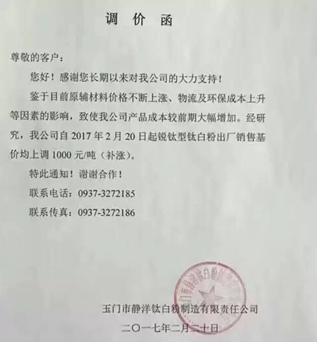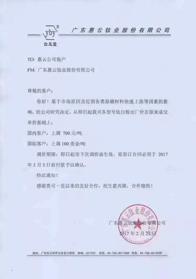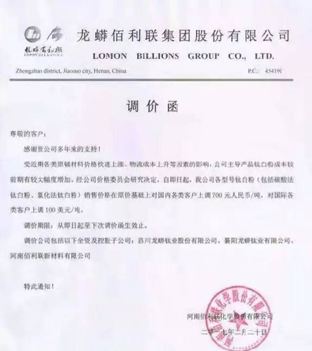 【中国涂料采购网】2月20日晚间,佰利联发布公告称,受近期各类原辅材料价格快速上涨、物流成本上升等因素的影响,河南佰利联化学股份有限公司主导产品钛白粉成本较前期有较大幅度增加。经公司价格委员会研究决定,自即日起,我公司各型号钛白粉(包括硫酸法钛白粉、氯化法钛白粉)销售价格在原价基础上对国内各类客户上调 700元人民币/吨,对国际各类客户上调100美元/吨。