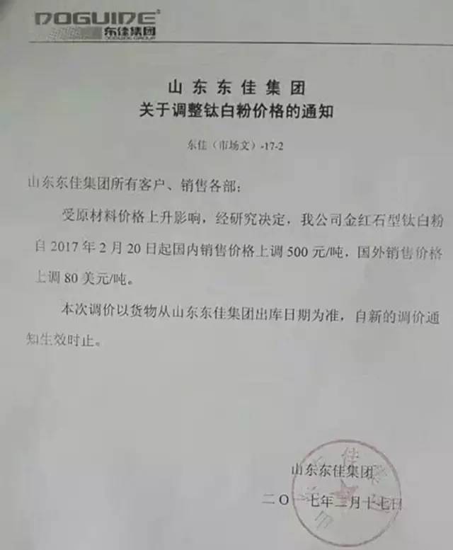 继钛白粉龙头企业龙蟒佰利联发出公告后,2月21日,潜江方圆钛白有限公司、广西德天化工循环股份有限公司、超彩环保新材料科技有限公司、广东惠云钛业股份有限公司、攀枝花市钛海科技股份有限公司、山东道恩钛业有限公司、中核华原钛白股份有限公司等多家钛白粉企业集体跟进上调钛白粉价格,上调幅度在500元/吨到800元/吨。