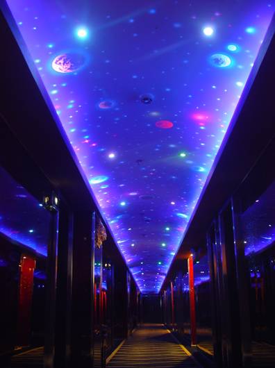 这时候打开紫光灯,奇迹出现了——原来的白墙上,出现了缤纷绚烂的瑰丽光影。