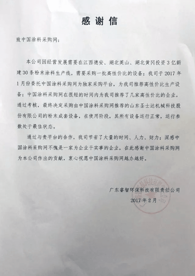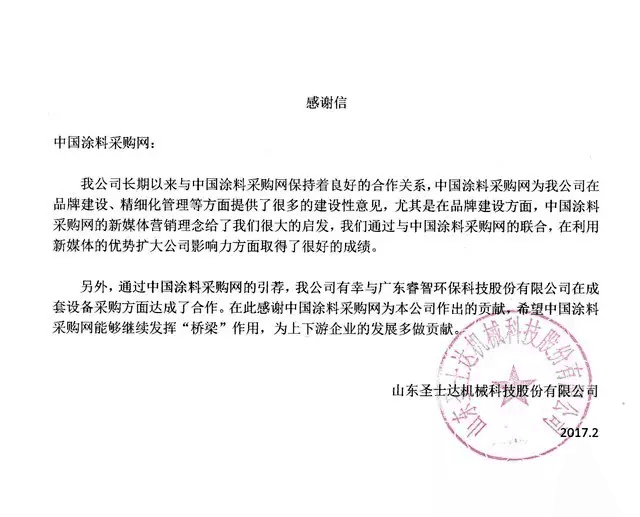 【中国涂料采购网】近日,中国涂料采购网受广东睿智环保科技有限责任公司委托,为其江西德安、湖北英山、湖北黄岗新建项目设备采购推荐高性价比生产设备。通过我们的努力,成功促成了广东睿智环保科技有限责任公司和山东圣士达机械股份有限公司之间的合作。