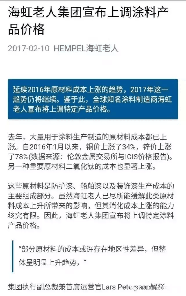【中国涂料采购网】近日,国外的一些涂料企业,迫于原材料价格持续上涨的压力,终于忍无可忍纷纷宣布提高产品价格。去年大量用于涂料生产制造的原材料成本都已上涨,自去年1月以来,铜价上涨了34%,锌价上涨了78%。另一种重要原材料二氧化钛的成本也显著上涨。这些原材料是防护漆、船舶漆以及装饰漆生产成本的主要组成部分,虽然海虹老人已尽所能缓解此类原材料成本上升所带来的影响,但其消化成本上涨的能力终究有限,因此,海虹老人集团宣布将上调特定涂料产品价格。此外,南京长江涂料有限公司因化工原材料、颜填料、辅助材料大幅涨价,物流费用也不断上涨,导致一些品种出现负毛利,于2月21日起调整部分产品价格。佐敦涂料由于2016年多种油漆的原材料成本大幅上涨,虽尽力消化油漆成本的大幅上升,但难以为继。因此不得不决定2月6日起,大幅上涨相关产品价格26%到40%。除此之外,三棵树涂料、嘉宝莉化工、广东巴德士等国内知名涂料企业也纷纷提价。国外涂料企业带头提价,终于让国内的一些中小型企业看到了希望,涂料企业终于迎来了涨价的春天。