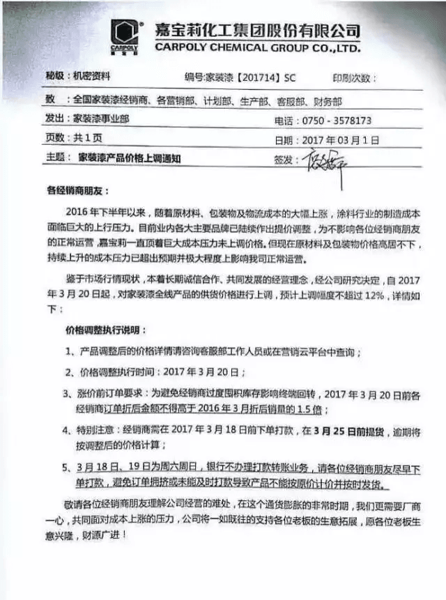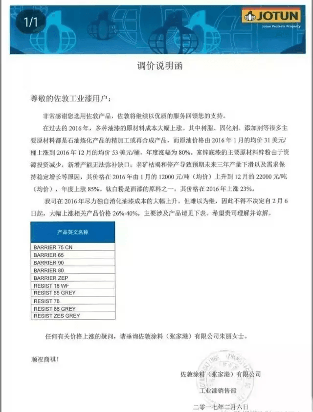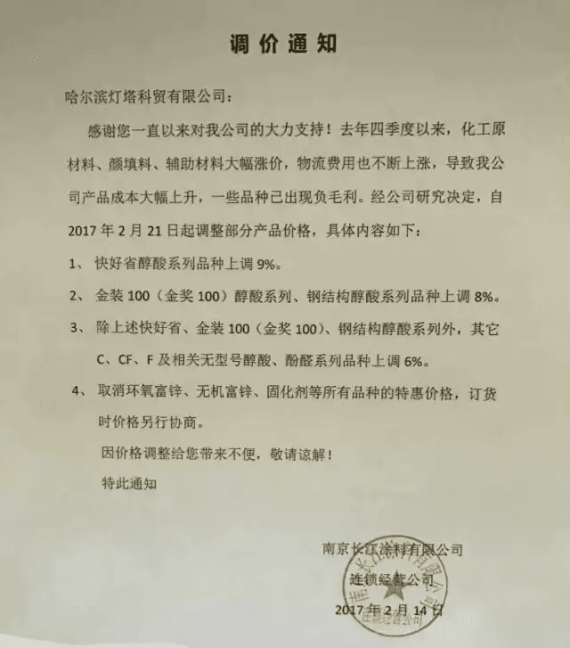 面临原材料持续不断地涨价,涂料企业忍气吞声地度过了2016年,2017年,原材料涨价依然猛烈,已经有相当一部分的涂料企业已经到了亏损的边缘,已经到了不涨就死,涨了就丢客户的尴尬境地。近日行业内的带头大哥终于出现了,这次这几家行业的龙头企业带动涂料企业涨价,很快会引发行业内的骨牌效应,带动国内的大批其他涂料企业跟进。