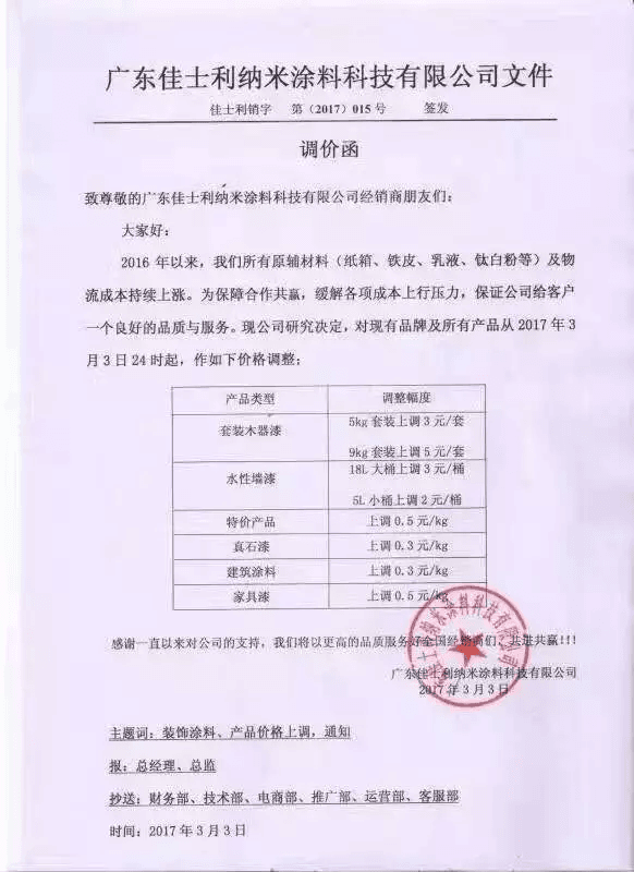 自2月20日至3月1日,第一批BETVLCTOR伟德国际网页版 宣布涨价后,就陆续有一批企业跟风涨价,这些涨价的企业又分为两类,一类是主动涨价的企业,这些企业的产品具备一定的竞争力,在行业内形成一定的品牌效应,有着固定的客户群体,客户的黏性很强,即使涨价,客户不但不会丢,反而有利于企业的发展,何乐而不为呢?还有一类则是被动涨价,由于原材料持续不断地涨价、物流运输成本上涨,使这些企业亏损严重,利润出现负增长,在此背景下,这些企业借着国内外知名企业提价的机会,纷纷上调产品价格,以此来保证企业的正常运转。据悉,BETVLCTOR伟德国际网页版 、依莱德、西卡等经销商纷纷透露计划在3月份实施涨价。其中包括家装漆和家具漆均有不同幅度的价格上浮,根据各企业的涨价信息,表明价格上浮主要集中在10%左右。