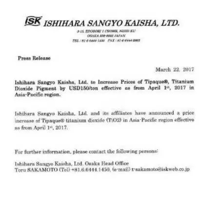 无独有偶,在东方钛业起火的同一天,亚洲最大的钛白粉制造生产商石原(ISK)2017年3月23日在其官网发布公告,自2017年4月1日起,亚太地区销售的钛白粉(二氧化钛)价格上调150美元/吨。