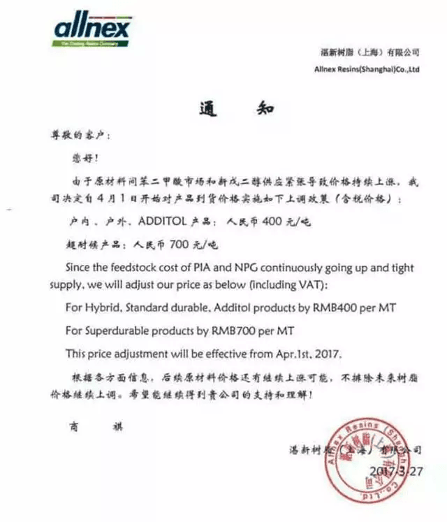 湛新树脂(上海)有限公司调价函