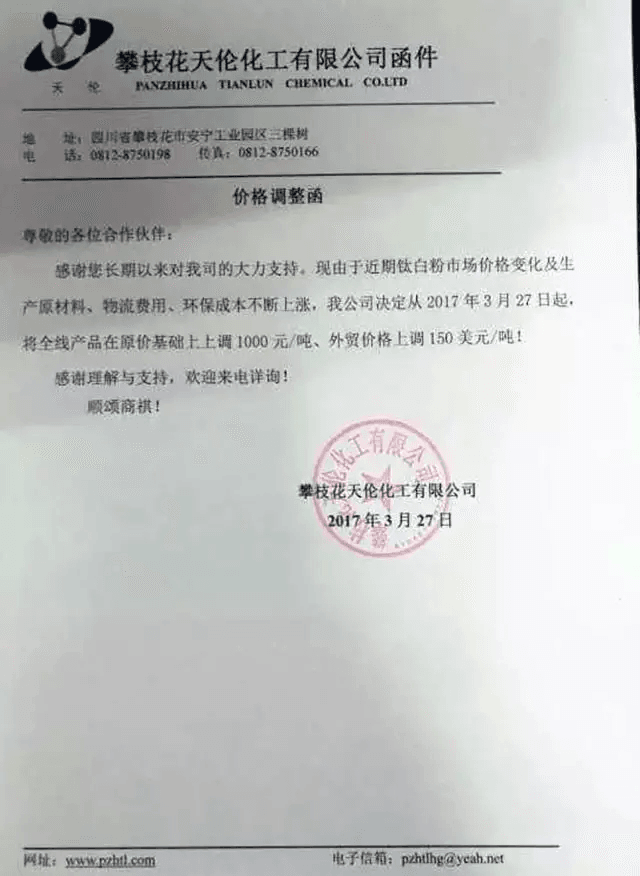 攀枝花天伦化工有限公司调价函