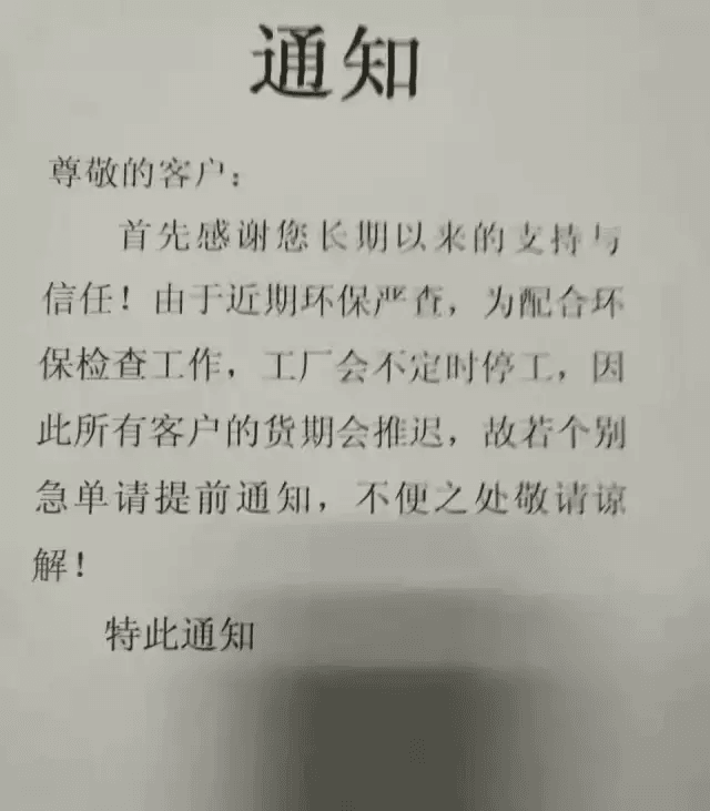 全国环保活动如火如荼,影响小则货期延长,影响大则工厂停工停产,导致部分订单无法按时出货。