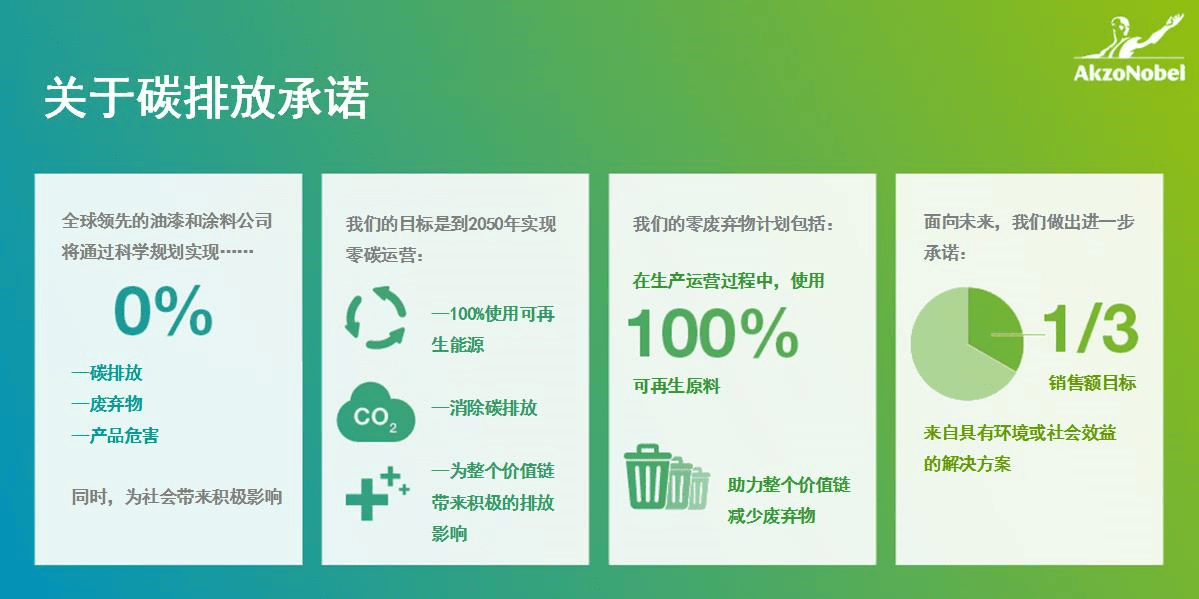 目前,阿克苏诺贝尔的可再生能源使用率为40%;2016年,公司近一半工厂的碳足迹得到改善。在当前成绩的基础上,阿克苏诺贝尔将加强推行“永续家园”可持续发展战略,由此制定了一系列目标。