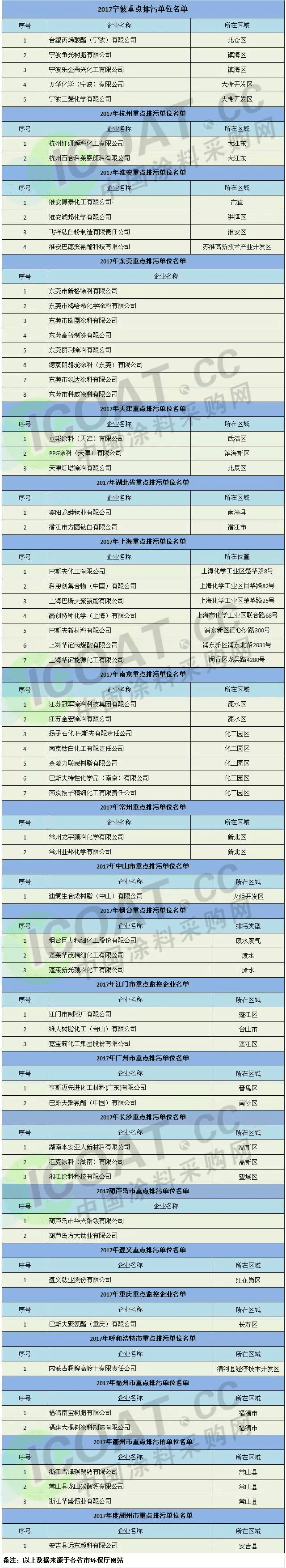 2017年各省市重点排污涂料原材料部分企业名单汇总
