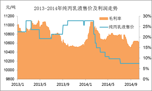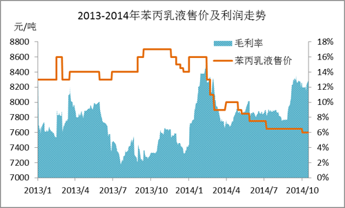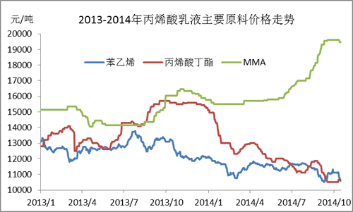 由上表可以看出,2014年9-10月丙烯酸乳液主要原料苯乙烯及丙丁酯均有较大跌幅,且伴随近期国际原油价格狂跌,后期丁酯及苯乙烯价位或仍有一定下行空间;另一原料MMA主要用于纯丙乳液,由于纯丙乳液市场占有率少,且MMA在纯丙中的添加量仅15%左右,所以即使MMA价格上涨也不能弥补另外两原料的跌幅。