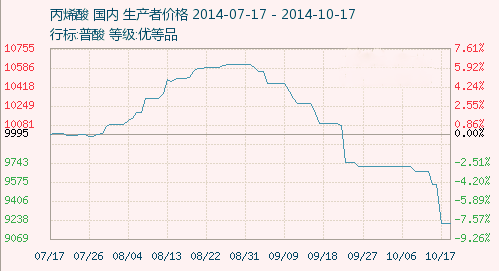 据榜数显示,本周(10月13-17日)丙烯酸出厂企业报价继续下调。截止周末国内丙烯酸出厂均价在9210元/吨,较周初下调3.61%,国内丙烯酸企业出厂报价同比去年下跌了31.93%。