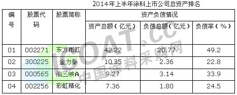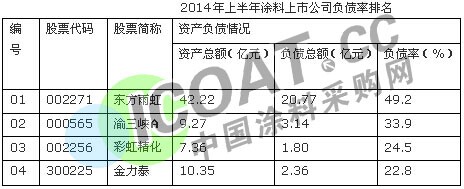 【中国涂料采购网】在很多时候,我们不管是对行业、企业发展进行评估、预测,看到的都是利好的一面,而有时候有些地方我们注意不到,而这些被我们忽略的地方往往最能反映出问题的真实性。2014年已进入最后的冲刺阶段,此时,我们对2014年上半年涂料上市公司的总资产及负债率进行简单的介绍。