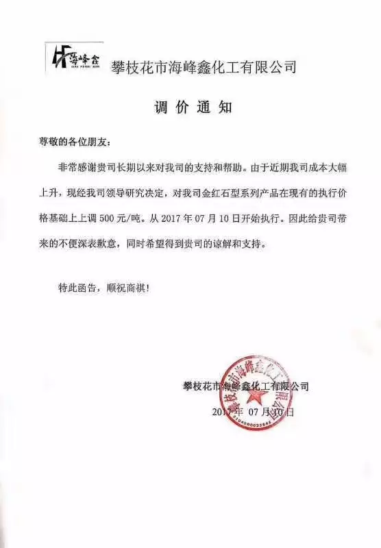 海峰鑫化工:金红石型钛白粉上调500元/吨;