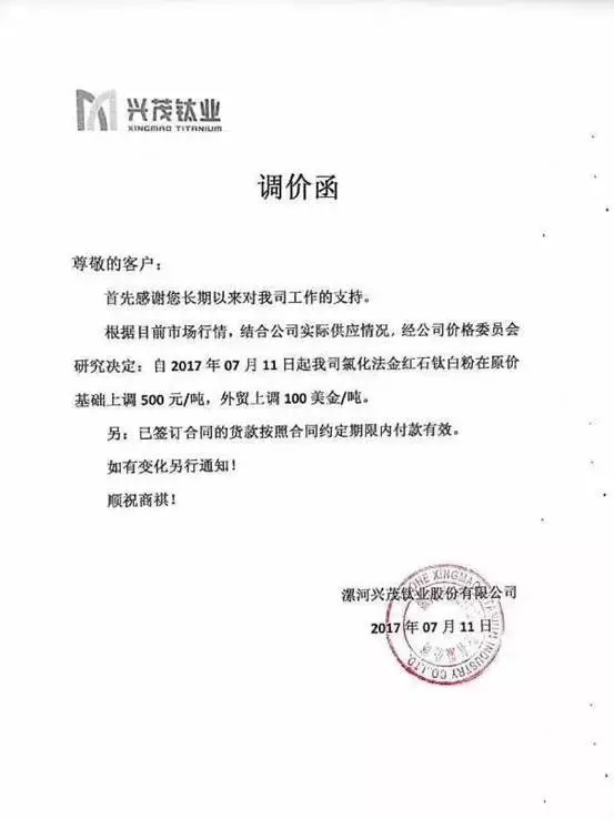 漯河兴茂:氯化法钛白粉国内市场上调500元/吨,国际市场上调100美元/吨。