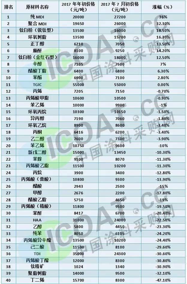 2017年上半年涂料主要原材料涨价排行榜