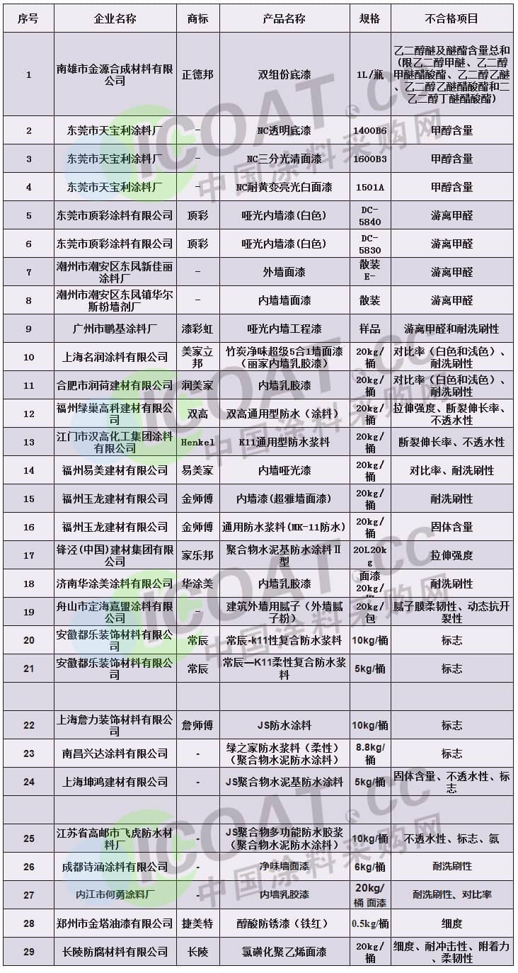 从上表可以看出,已查出不合格的29种涂料产品,主要不合格项目表现为乙二醇醚及醚酯含量总和、甲醛含量、游离甲醛、断裂伸长率、不透水性、对比率、细度、耐洗刷性、附着力、柔韧性、拉伸强度等。