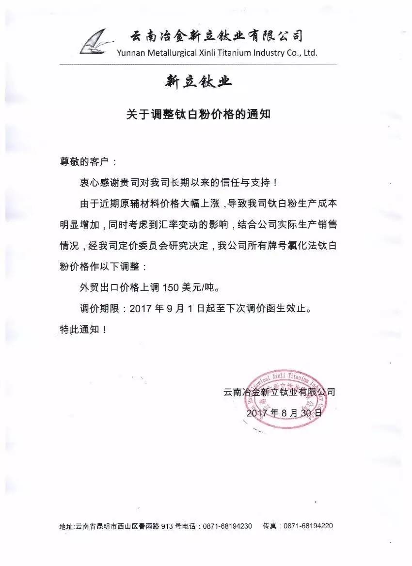 云南冶金新立钛业有限公司,8月30日发布涨价通知,决定9月1日起,氯化法钛白粉外贸出口价格上调150美元/吨。