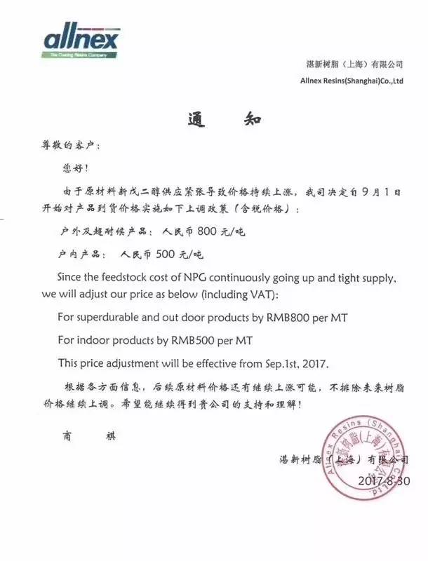 湛新树脂(上海)有限公司,8月30日发布涨价通知,决定9月1日起,户外及超耐候性产品上调800元/吨,户内产品上调500元/吨。