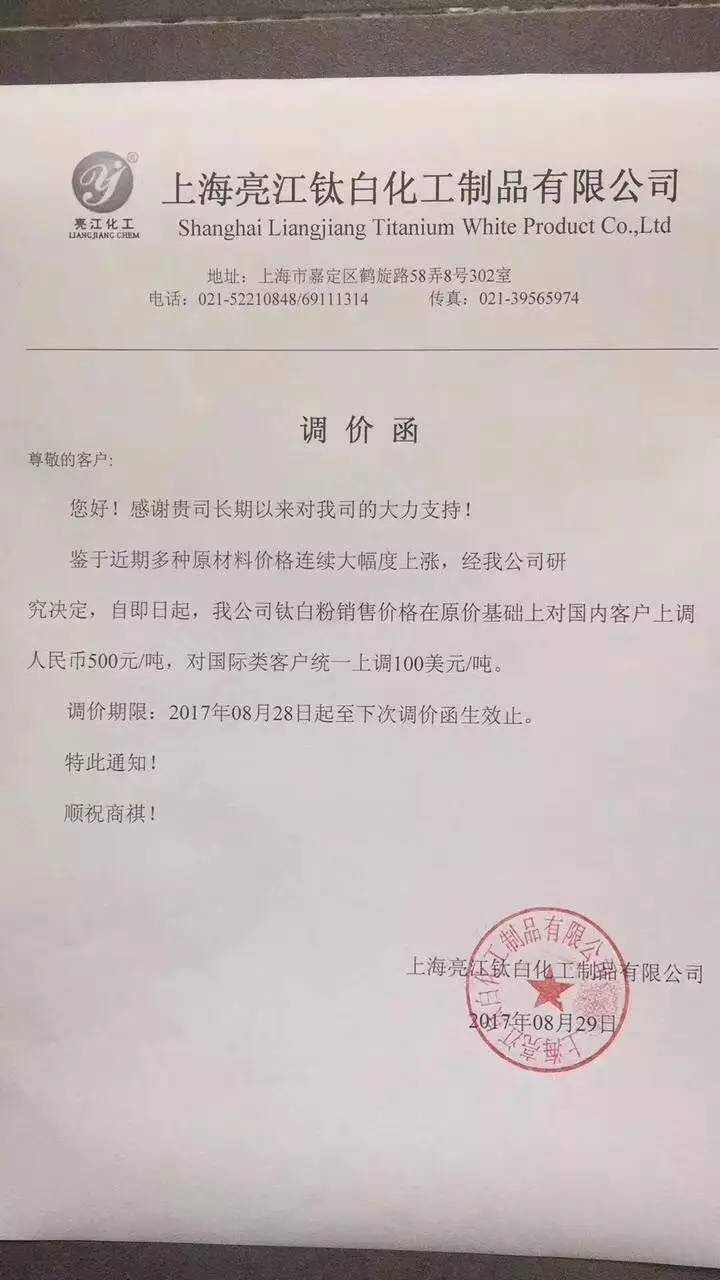 上海亮江钛白化工制品有限公司,8月29日宣布其钛白粉销售价格在原价的基础上对国内客户上调500元/吨,对国际类客户统一上调100美元/吨。