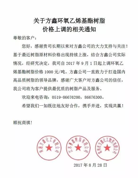 南通市方鑫化工有限公司、江苏赛鑫树脂有限公司、常州市方鑫化工有限公司,8月28日联合下发了方鑫环氧乙烯基酯树脂价格上调通知函,通知函称,基于最近树脂原材料价格出现持续上涨,结合方鑫公司实际情况,经研究决定,自2017年9月1日起上调环氧乙烯基酯树脂价格1000元/吨。