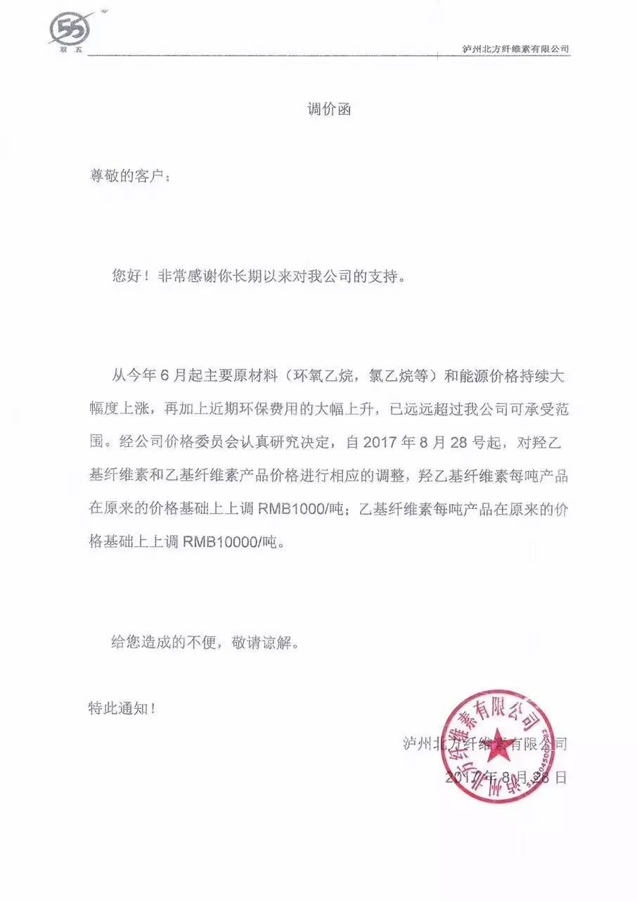 泸州北方纤维素有限公司,8月28日,也下发涨价通知函,决定自8月28日起,对羟乙基纤维素和乙基纤维素产品价格进行相应的调整,羟乙基纤维素每吨产品在原来的价格基础上上调RMB1000元/吨,乙基纤维素每吨产品在原来的价格基础上上调RMB10000元/吨。