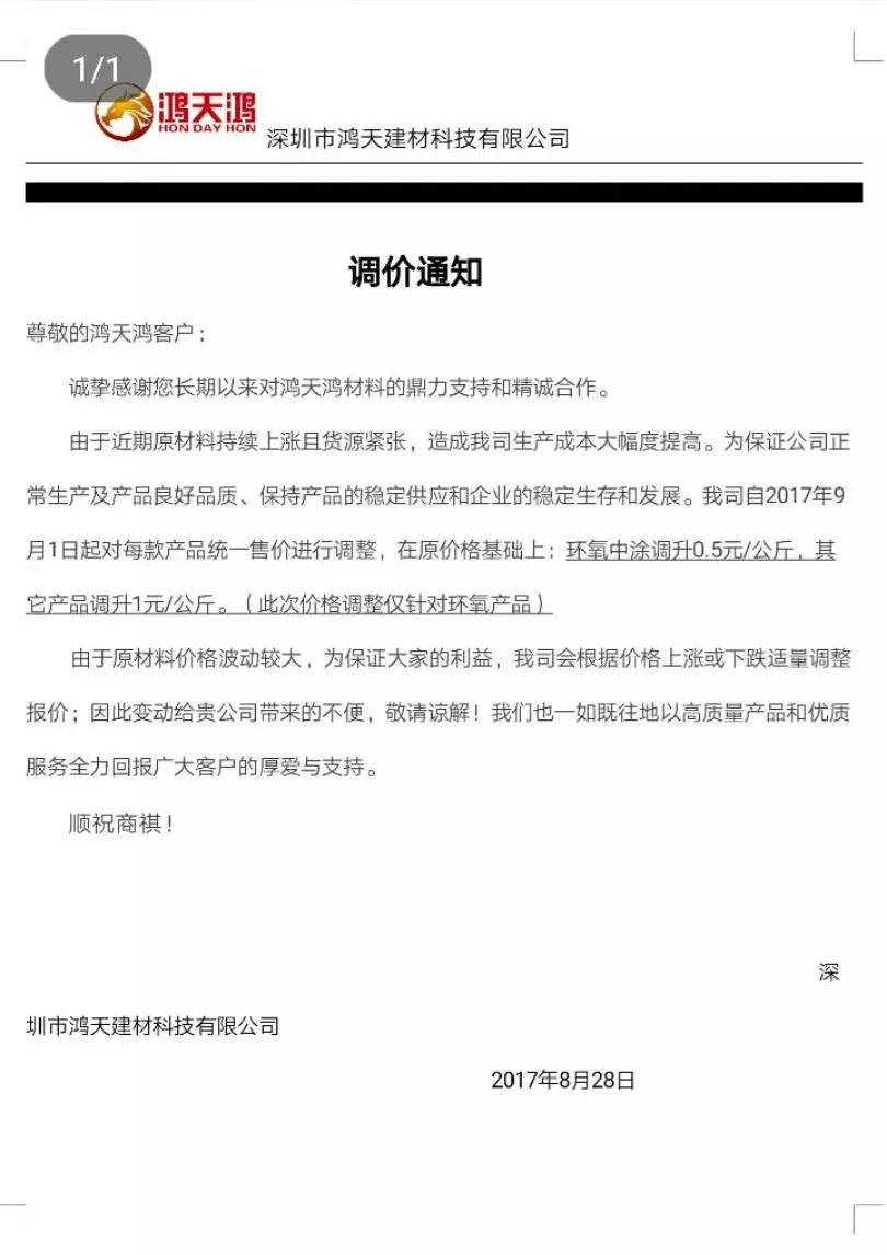 深圳鸿天建材科技有限公司,8月28日下发涨价通知函,决定自9月1日起对每款产品统一售价进行调整,在原价格基础上:环氧中涂上调0.5元/公斤(合上调500元/吨),其它产品上调1元/公斤(合上调1000元/吨)。