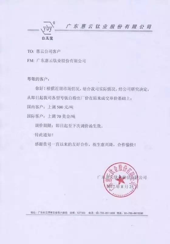 广东惠云钛业股份有限公司,8月25日,广东惠云钛业股份有限公司发布涨价通知,通知称,根据近期市场情况,结合实际情况,决定从即日起,各型号钛白粉出厂价,在原来成交单价上,国内客户上调500元/吨,国际客户上调70美金/吨。