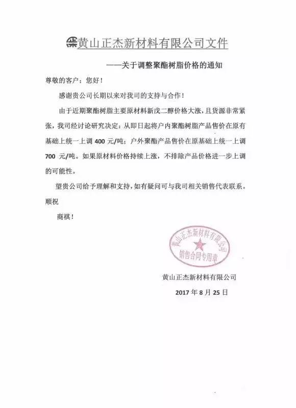 黄山正杰新材料有限公司,8月25日,黄山正杰新材料有限公司发下涨价函,表示受原材料新戊二醇上涨的影响,其户内聚酯树脂产品售价在原有基础上统一上调400元/吨,户外聚酯产品售价在原基础上统一上调700元/吨。