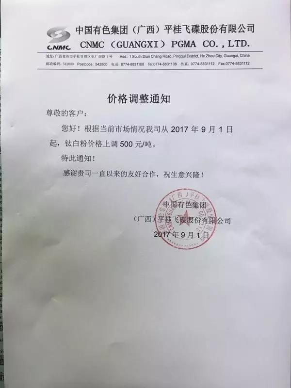 中国有色集团(广西)平桂飞碟股份有限公司宣布,9月1日起,其钛白粉价格上调500元/吨。
