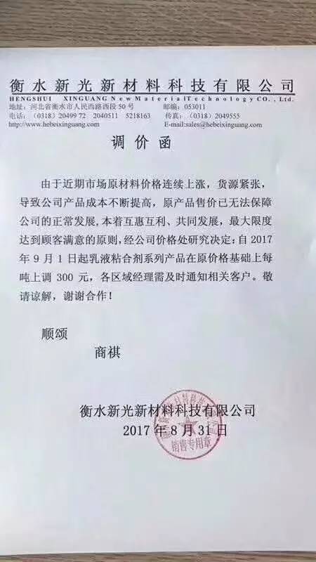 衡水新光新材料科技有限公司宣布9月1日起,乳液粘合剂系列产品在原价格基础上每吨上调300元。