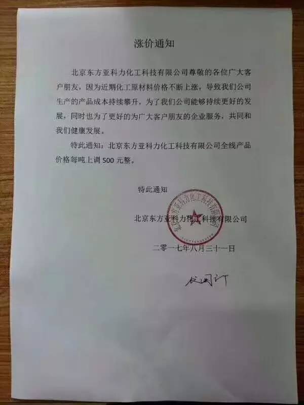 北京东方亚科力化工科技有限公司8月31日宣布其全线产品价格每吨上调500元整。
