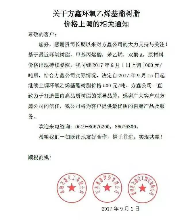 南通市方鑫化工有限公司、江苏赛鑫树脂有限公司、常州市方鑫化工有限公司,8月28日联合下发了方鑫环氧乙烯基酯树脂价格上调通知函,通知函称,基于最近树脂原材料价格出现持续上涨,结合方鑫公司实际情况,经研究决定,自2017年9月1日起上调环氧乙烯基酯树脂价格1000元/吨。