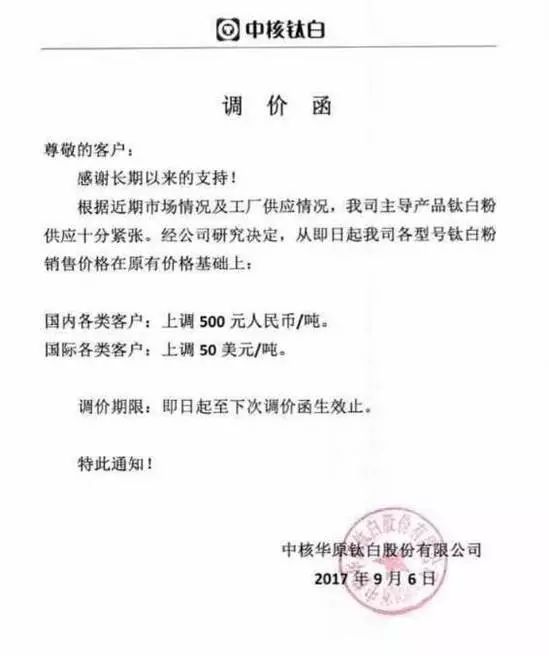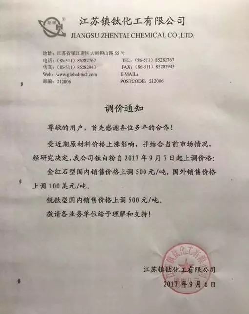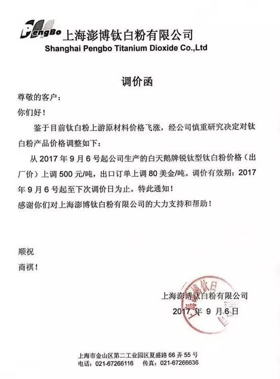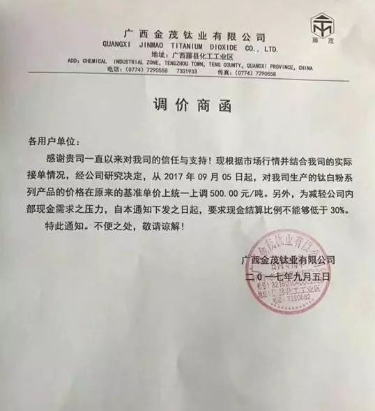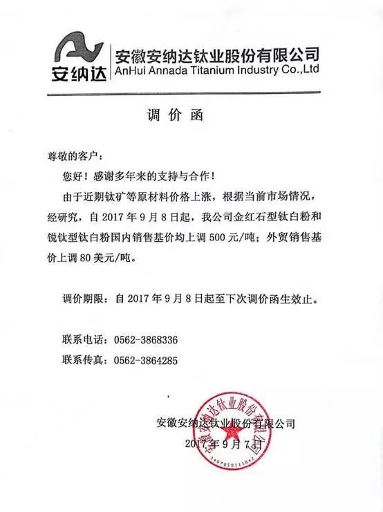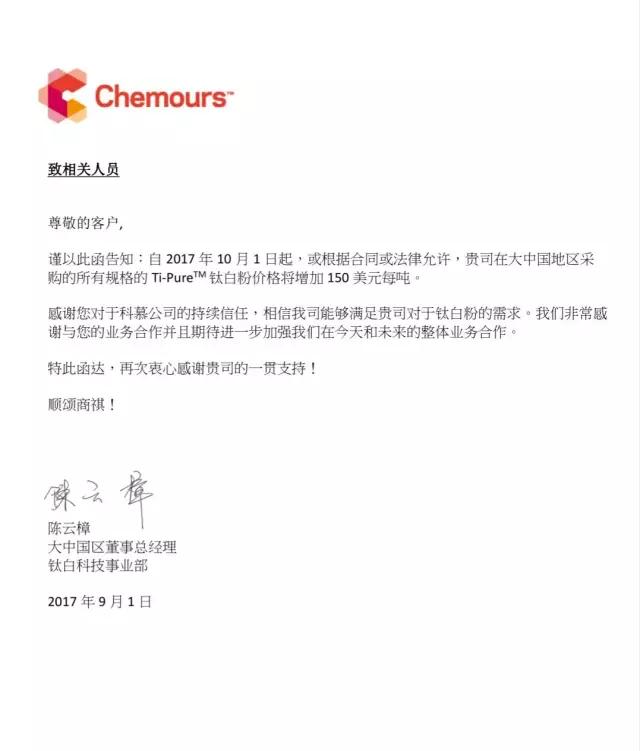 除国内钛白粉企业之外,国际巨头科慕公司也发出钛白粉提价公告。公告中称,自10月1日起,科慕旗下所有规格的Ti-Pure™钛白粉价格在中国大陆原有的基础上上调150美元/吨(合计975元/吨)。