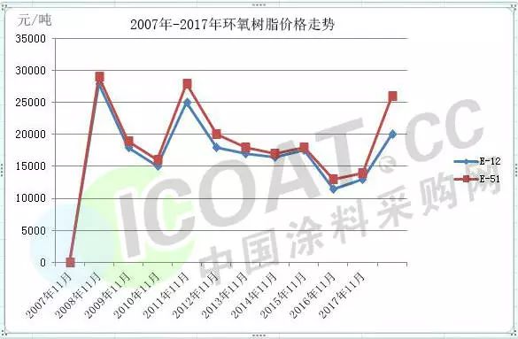 今年年初时,液体环氧树脂价格一直在14800元/吨附近上下晃动,这种状态持续到今年8月份。8月份受中央环保督察影响,国内环氧树脂市场价格从8月份开始开启上行通道。据中国涂料采购网统计,华东液体环氧树脂市场从8月15日15900元/吨,到11月26日上涨到26050元/吨,在短短3个多月的时间上涨幅度达63.8%。在原料上涨,且产能较低的情况下,市场压力逐渐增加,曾一度出现涨价还没货。