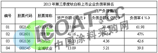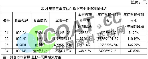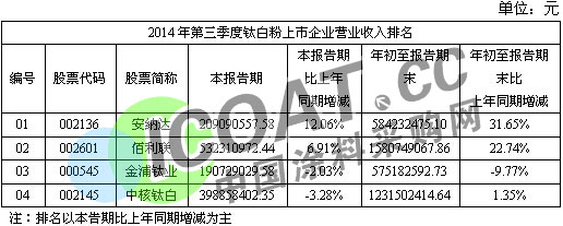 【中国涂料采购网】继“2014年第三季度涂料上市企业发展分析”发布之后,我们对涂料上市企业及涂料行业的发展有基本的了解,然而涂料的利润空间一方面受制于下游市场的需求,另一方面则受制于上游产品的市场价格走势,在涂料的生产过程中,钛白粉占有很大比例。换言之,钛白粉市场的发展对涂料行业及企业的发展都有很大的影响,因此,我们将通过营业收入、净利润、负债率三方面的情况,了解钛白粉上市企业的发展现状及钛白粉行业的发展。