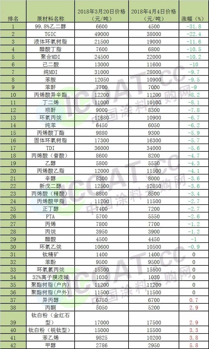 从以上数据可以看出,3月下旬以来,大部分原材料价格呈下跌趋势。据中国涂料采购网统计的42种产品中,仅甲醇、苯乙烯、钛白粉(锐钛型)、丙酮、钛白粉(金红石型)、异丙醇等6种产品微涨,分别为5.8%、3.8%、3.3%、2.9%、2.9%、0.7%。有6种产品价格无变化。30种产品呈下跌趋势,其中99.8%乙二醇下跌最为严重,跌幅达31.8%,其次为TGIC,跌幅为22.4%。液体环氧树脂跌幅达11.6%。