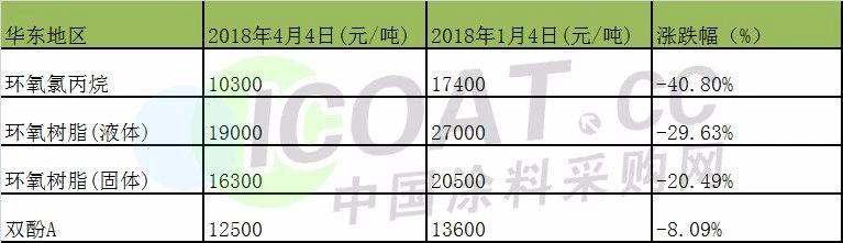 2018年第一季度整个环氧树脂产业链均呈现出下跌走势,且跌幅明显。其中跌幅最大的是环氧氯丙烷,达40.8%;其次是环氧树脂,尤其是液体环氧树脂跌幅29.63%。