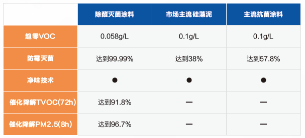 通过以上对比,我们可以看出,市场主流的硅藻泥、主流的抗菌涂料其VOC的排入都在0.1g/L左右,而除醛灭菌涂料的VOC控制在0.058g/L左右,远远低于市场主流的硅藻泥、主流抗菌涂料的排入值;而且在灭菌方面,除醛灭菌涂料的防霉灭菌值达到99.99%,而市场主流硅藻泥的防霉灭菌值则达到38%,主流抗菌涂料的防霉灭菌值达到57.8%,相比之下,除醛灭菌涂料的优势一览无余。