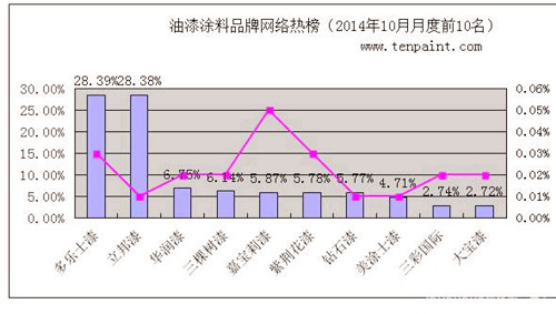 纵观10月份油漆涂料品牌网络热度榜单,其他上榜品牌受关注度都有明显增加。三棵树漆热搜值为6.14,环比增加0.02%,同比增加0.64%;嘉宝莉漆强势不减,成为10月份油漆涂料品牌网络热榜中环比唯一增加0.05%的品牌,同比增加1.07%;紫荆花漆和钻石漆表现不错,热搜值分别达到5.78%和5.77%,,同比增加1.58%和1.37%,这两大品牌的实力再一次得到印证;美涂士漆和三彩国际也依然榜上有名,受关注度分别为4.71%和2.74%,同比增加1.31%和0.54%;而上月排名在TOP十以外的大宝漆则与来威漆你追我赶,本月挤掉来威漆,蹿升至第十位。