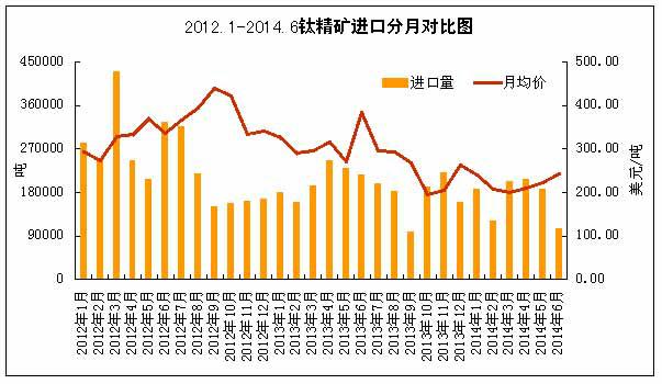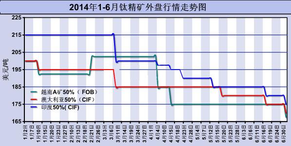 价格的发展往往受到下游市场需求及上游原材料价格走势来决定的。自2011年下半年以来,国内钛白粉市场价格处于低位运行状态,对国内钛精矿产品的价格也造成了很大的影响。从下图我们可以看出,自2014年以来,全球钛精矿市场价格出现下滑,以越南为例,从2014年1月份200美元/吨下滑到6月30日的167美元/吨左右,每吨下滑近30美元。