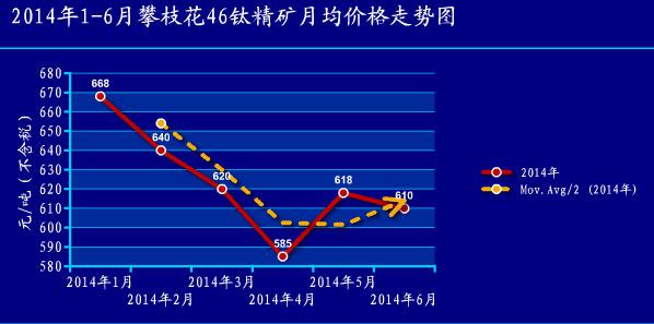 2014年上半年国际钛精矿市场价格的下滑,影响了国内钛精矿市场价格的走势,据中国涂料采购网了解,自2014年1月至2014年4月,国内钛精矿市场价格出现大幅跳水,以攀枝花46钛精矿为例,从下图我们可以看出,国内攀枝花46钛精矿市场价格从1月668元/吨(不含税)降至4月份的585元/吨,下滑幅度达83元/吨。5月份国内钛精矿市场价格迎来一次小涨,调涨至618元/吨,上涨33元/吨,较2014年1月份,仍处于下滑态势。