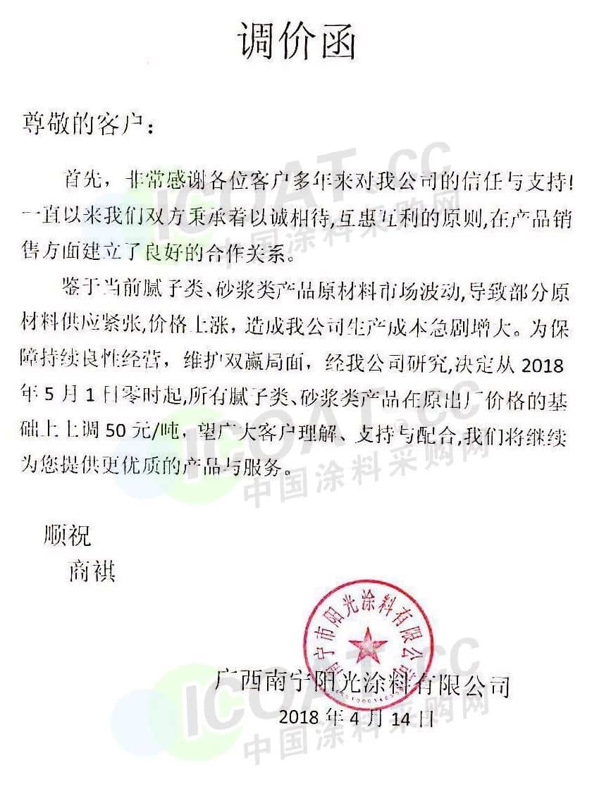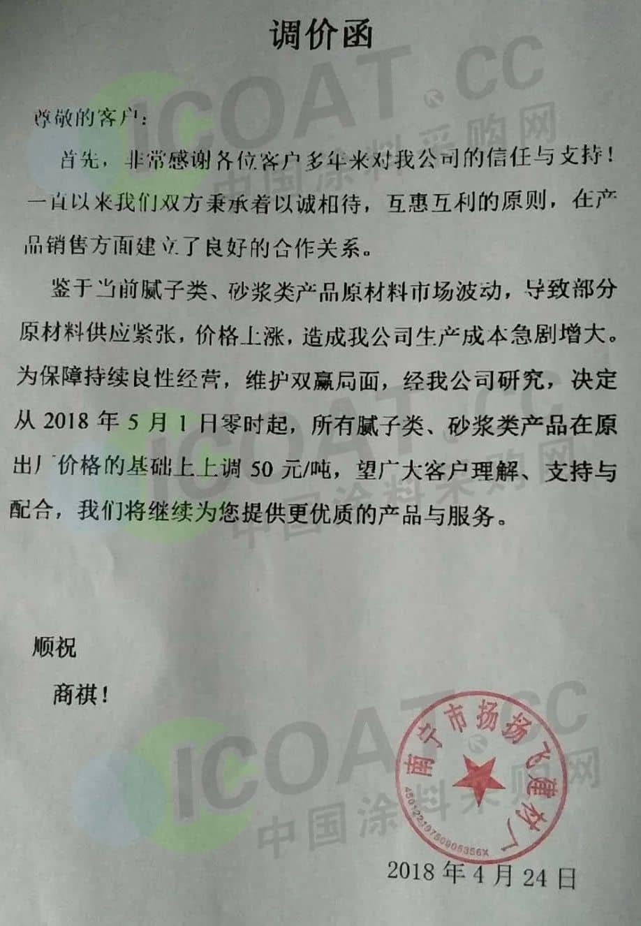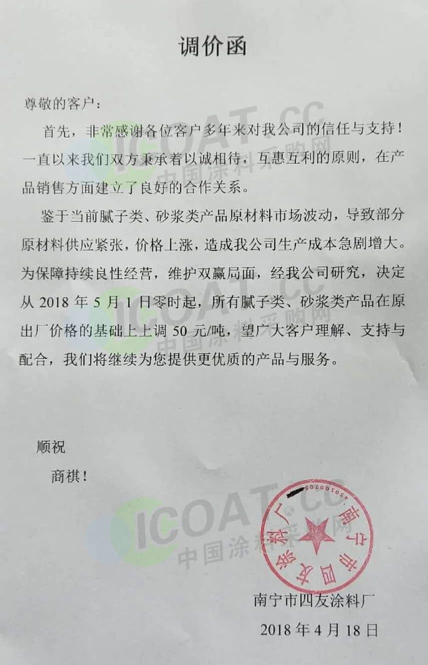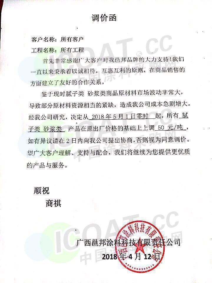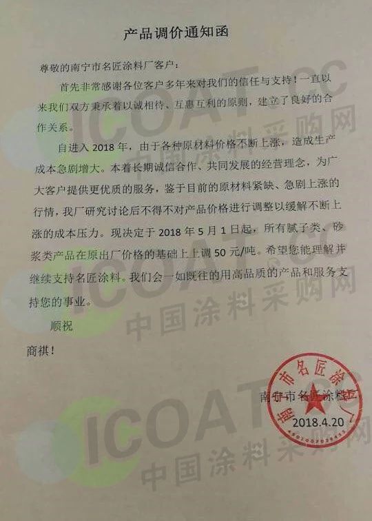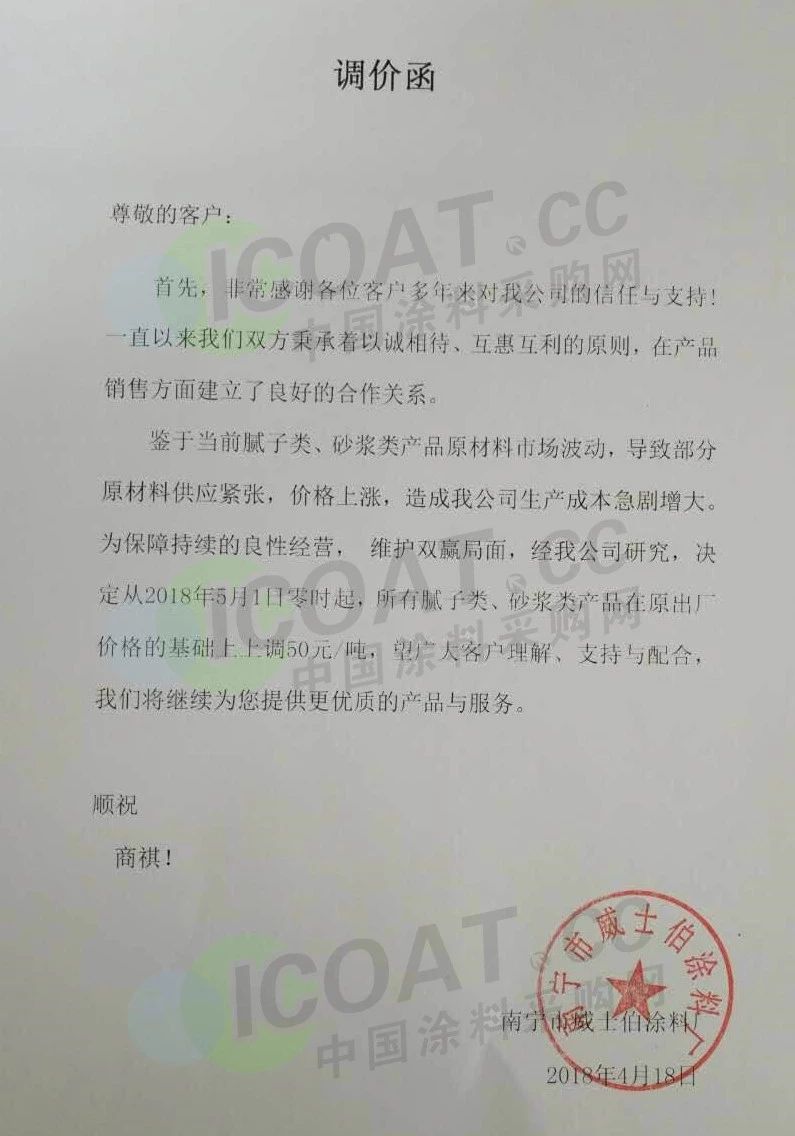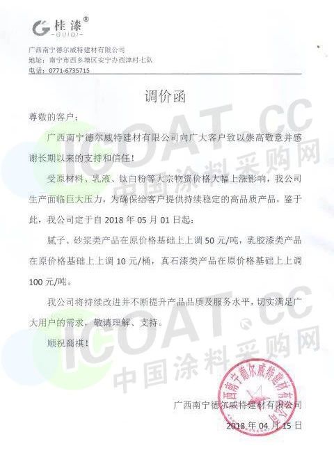 【中国涂料采购网】持续几年的原材料涨价,已经让下游的涂料企业苦不堪言,很多企业已经到了亏损的边缘。由于近期原材料价格依然在高位运行,甚至部分原材料价格已经突破历史高位,随着国外立邦,阿克苏等外资企业纷纷涨价,近期国内有一百多家涂料企业选择五月一日开始上调产品价格,以应对原材料涨价带来的压力,部分涂料企业涨价函如下: