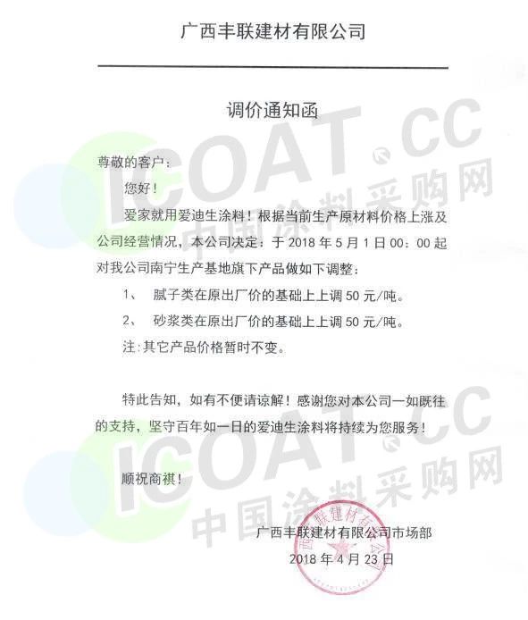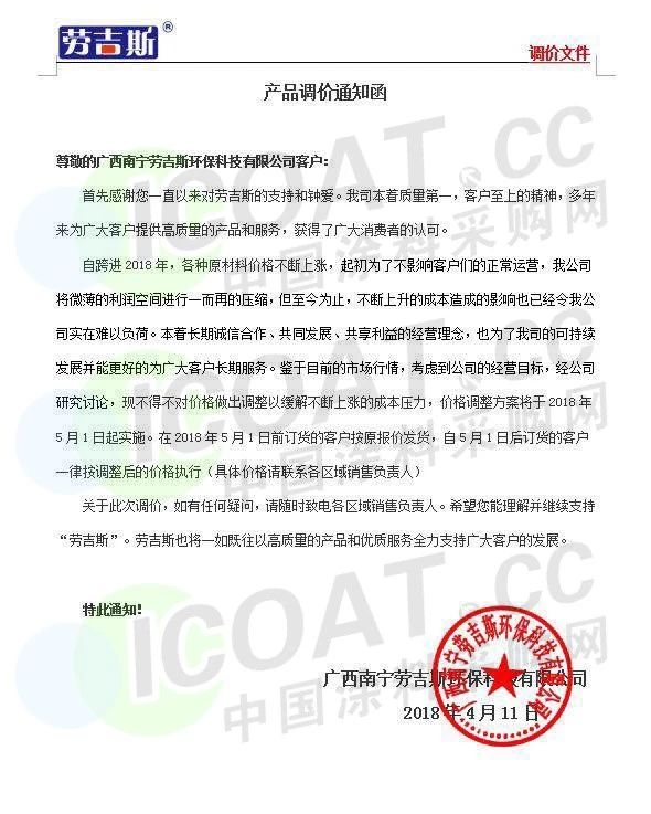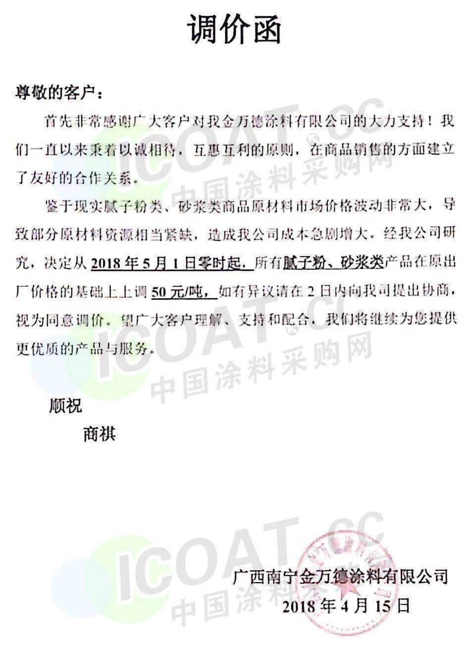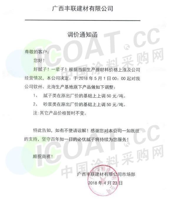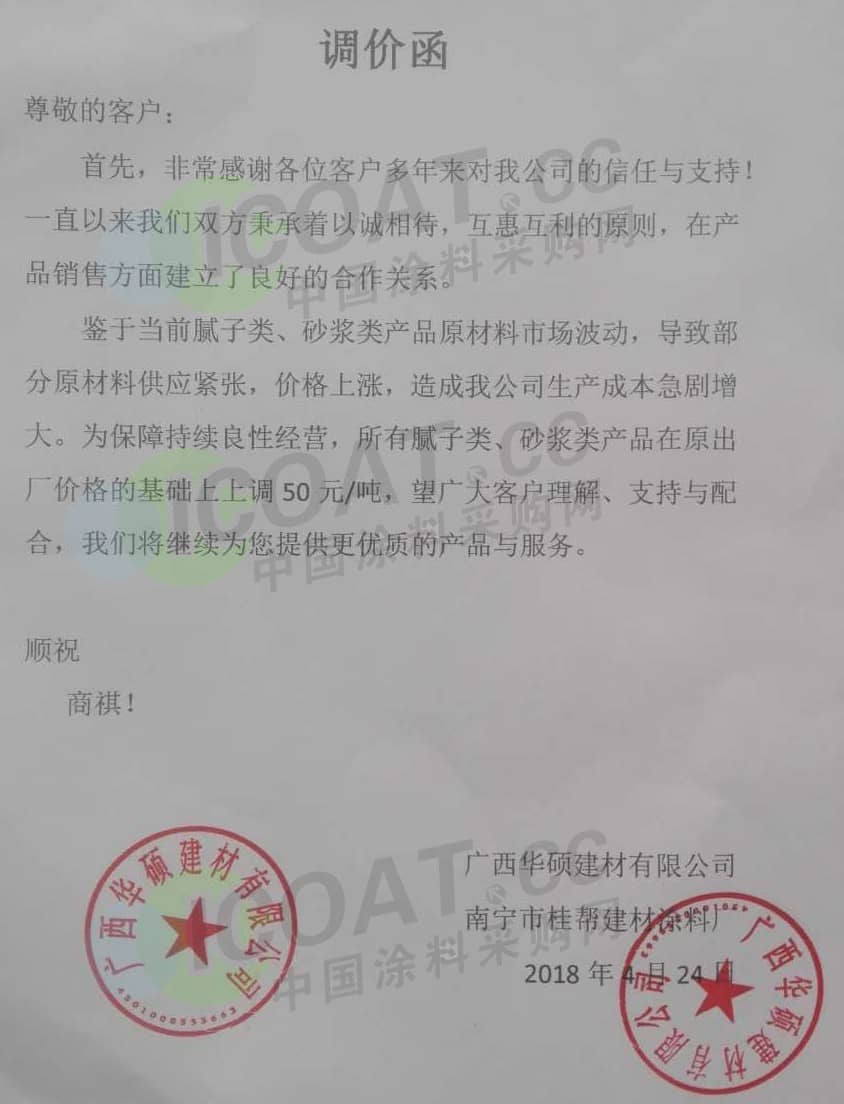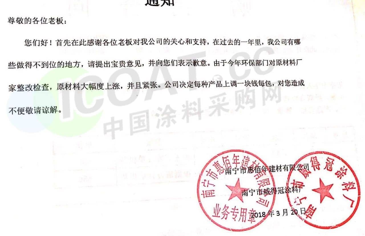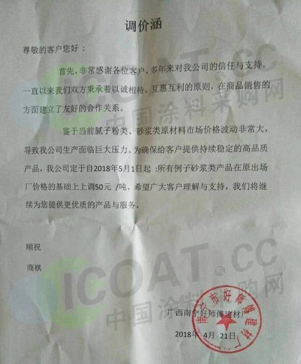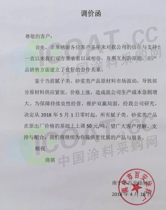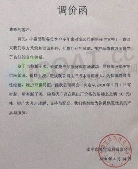 【中国涂料采购网】持续几年的原材料涨价,已经让下游的涂料企业苦不堪言,很多企业已经到了亏损的边缘。由于近期原材料价格依然在高位运行,甚至部分原材料价格已经突破历史高位,随着国外立邦,阿克苏等外资企业纷纷涨价,近期国内有一百多家涂料企业选择五月一日开始上调产品价格,以应对原材料涨价带来的压力,部分涂料企业涨价函如下: