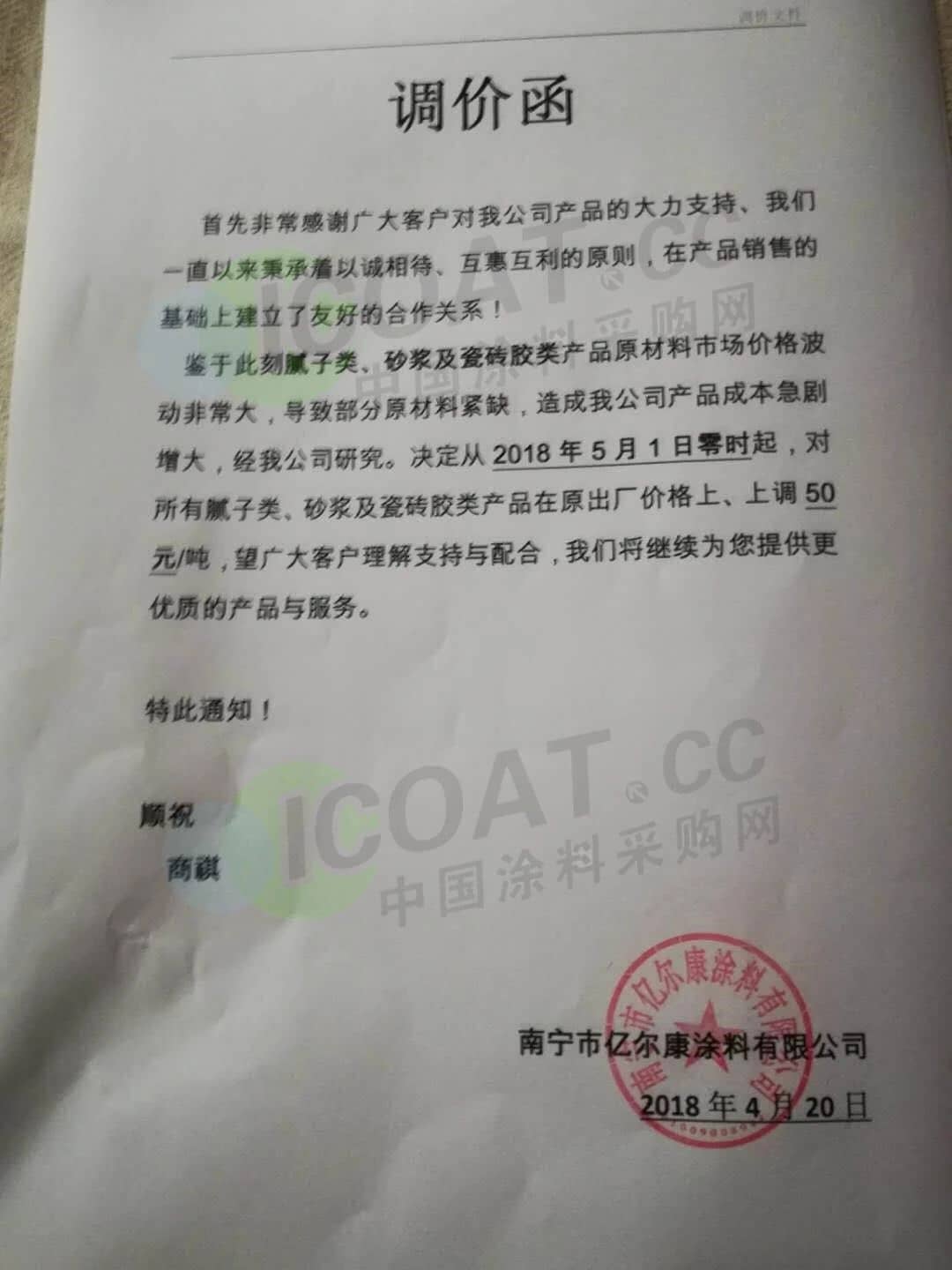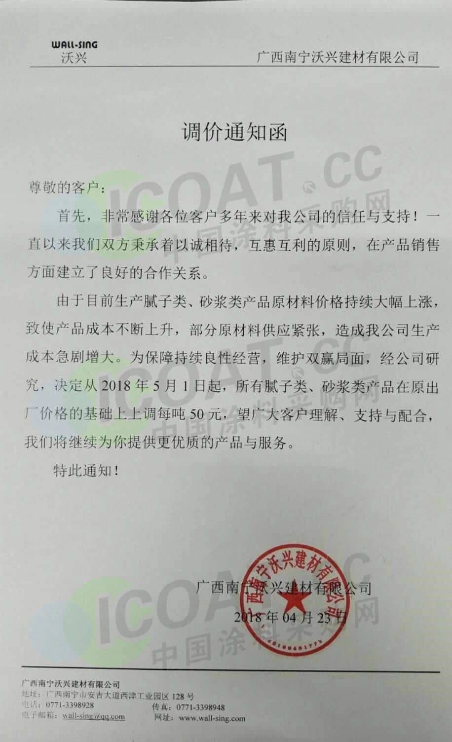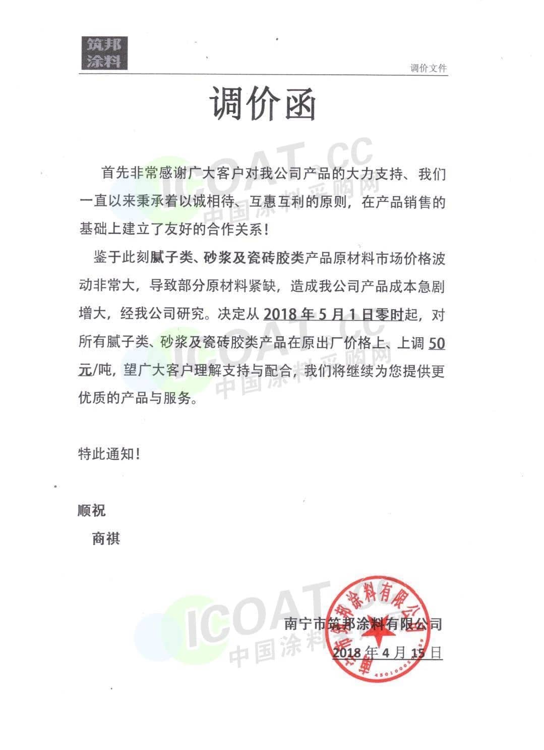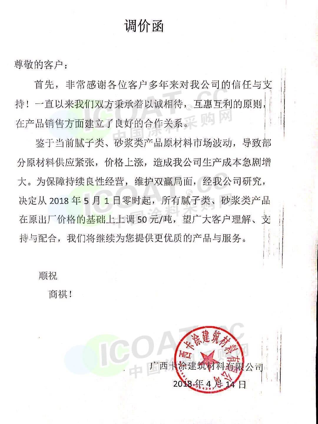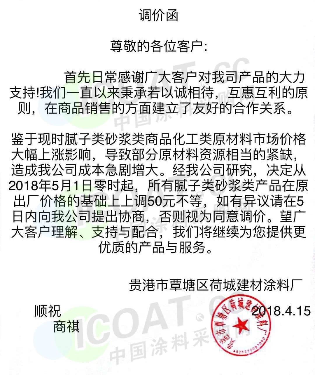 【中国涂料采购网】持续几年的原材料涨价,已经让下游的涂料企业苦不堪言,很多企业已经到了亏损的边缘。由于近期原材料价格依然在高位运行,甚至部分原材料价格已经突破历史高位,随着国外立邦,阿克苏等外资企业纷纷涨价,近期国内有一百多家涂料企业选择五月一日开始上调产品价格,以应对原材料涨价带来的压力,部分涂料企业涨价函如下: