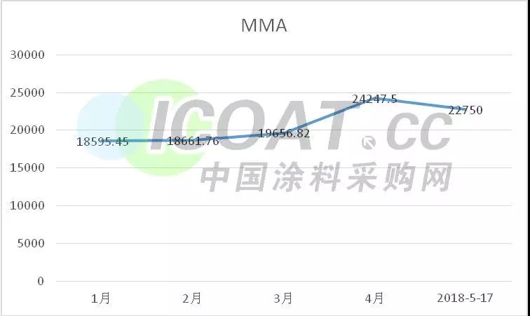 自2018年初开始,各厂陆续公布了年内的检修计划,MMA市场价格在经历年初短暂的下跌行情过后一路上扬,并在4月初到达历史巅峰。5月份MMA市场装置检修更为密集,吉林石化、惠菱化成以及璐彩特装置均停车检修。目前华东一级合约市场收于22500-23500元/吨,华东贸易现货市场商谈多在22500-23000元/吨之间展开。价格重心逐渐回归理性。