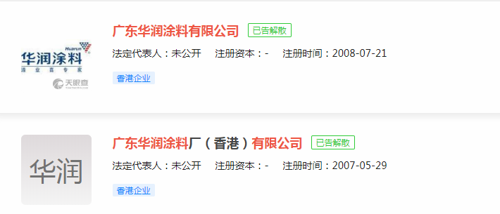 当年,华润涂料在被威士伯收购之后,旗下广东华润涂料厂(香港)有限公司和广东华润涂料有限公司也分别于2016年5月13日、2012年8月31日公告解散。