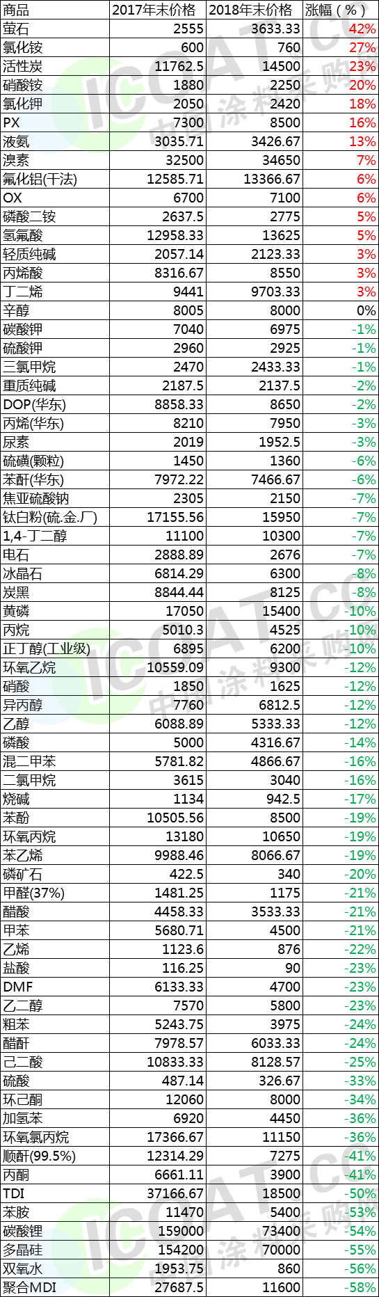 据涂料采购网了解,布伦特原油价格指数2018年累计下跌19.5%,WTI原油价格指数累计下跌24.8%,两指数均为2015年以来首次年度下跌。国际原油价格下滑对涂料原材料价格的走势有着很大的影响,截至2018年12月31日,52种涂料原材料价格出现大幅度下滑,最大下滑幅度达58%。