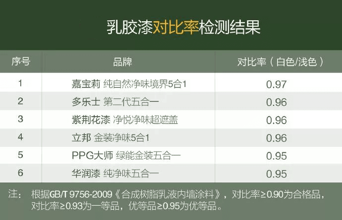 综合安全方面的游离甲醛、苯类指标,性能方面的对比率、耐洗刷性指标,《消费者报道》得出多款乳胶漆的综合评价。